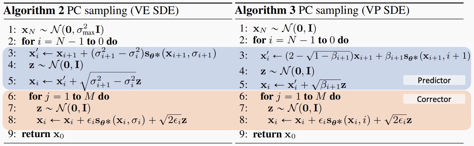 根据欧拉-丸山法,其离散形式为: \(\mathbf{x}_{t+1}=\mathbf{x}_t+ \frac {\sigma^2_t} 2 \nabla_{\mathbf{x}} \log p\left(\mathbf{x}_t\right)\Delta t+\sigma_t \sqrt{\Delta t} \mathbf{z}, \quad \mathbf{z} \sim \mathcal{N}(0, \mathbf{I})\)