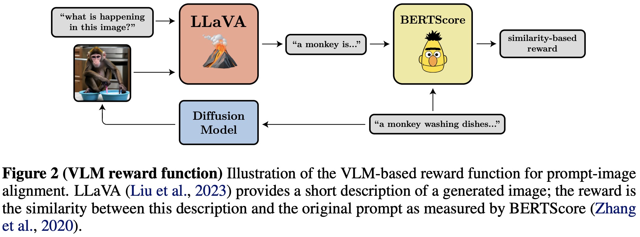 奖励函数根据下游任务确定,下图是一个提示-图像对齐的示例,给一个提示文本,扩散模型生成图像,利用VLM模型给生成的图像生成描述,最后再利用LLM模型判断原始提示文本与生成描述的相似度作为奖励。