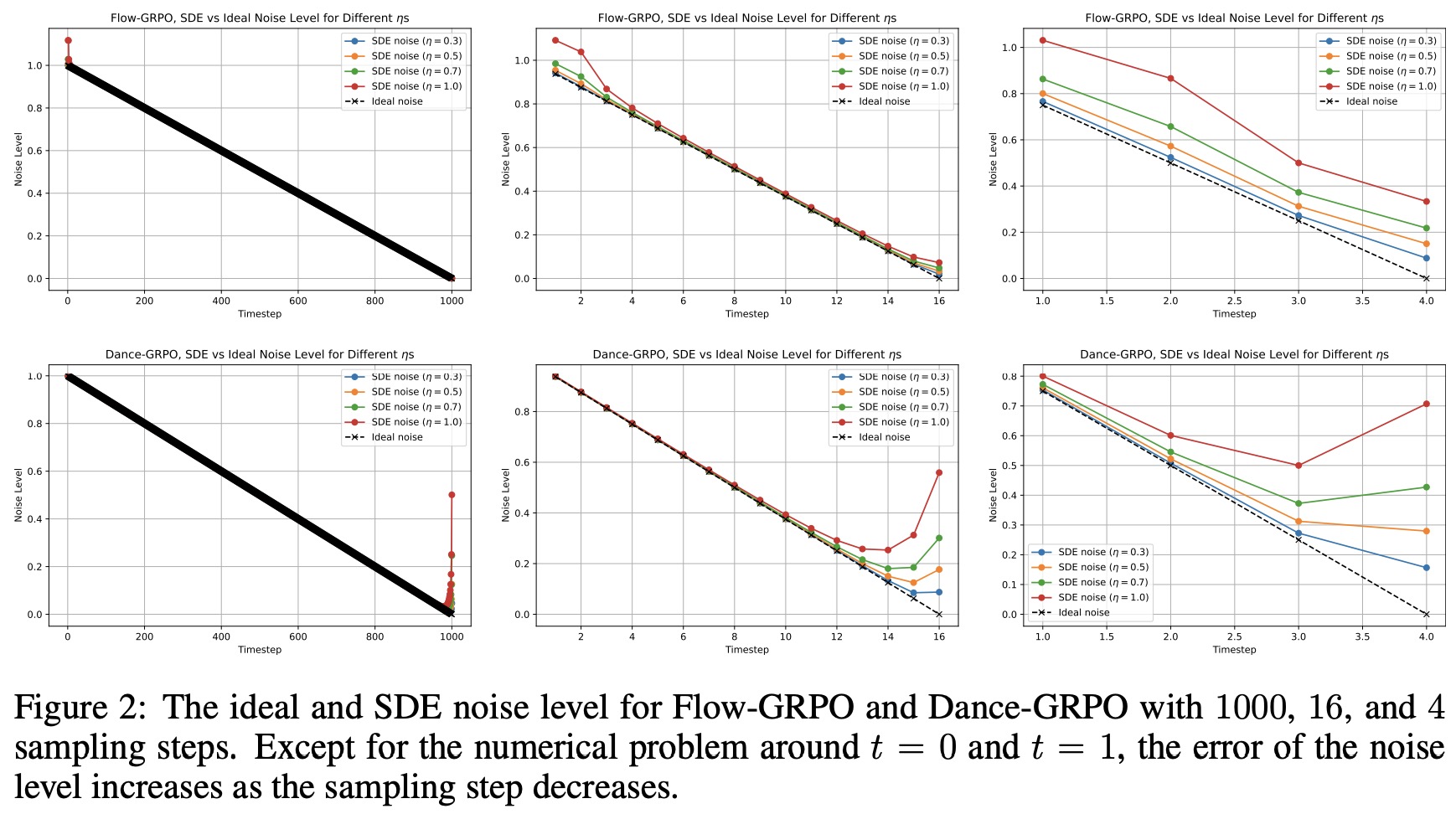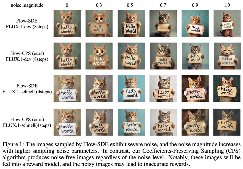 COEFFICIENTS-PRESERVING SAMPLING FOR REINFORCEMENT LEARNING WITH FLOW MATCHINGFlow-GRPO、Dance-GRPO 等方法为了获得样本多样性,将确定性 Flow-ODE 改写成随机微分方程(SDE),但生成的图像在训练阶段始终带有显著噪声。本文通过理论分析表明,SDE 每步注入的随机项与调度器要求的噪声水平不匹配,造成“超额噪声”不断累积,最终噪声水平不为零。