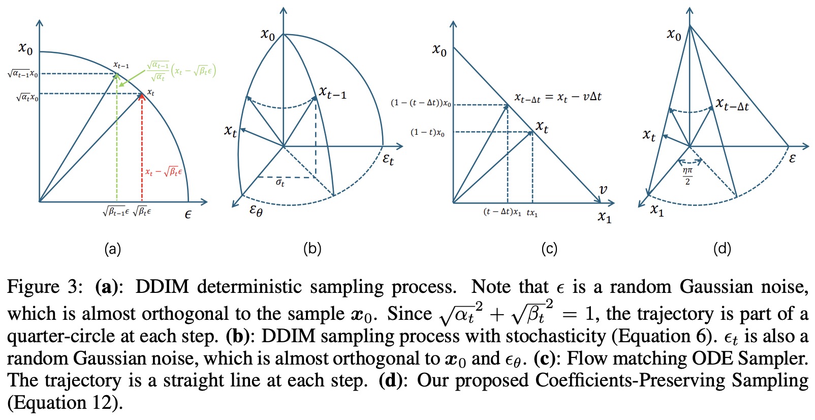 \[\boldsymbol{x}_{t-\Delta t} = (1 - (t - \Delta t)) \hat{\boldsymbol{x}}_0 + (t - \Delta t) \cos(\frac{\eta \pi}{2}) \hat{\boldsymbol{x}}_1 + (t - \Delta t) \sin(\frac{\eta \pi}{2}) \epsilon,\]其中 $\eta \in [0, 1]$ 控制随机强度。该公式满足CPS的要求,并具有如图3.d所示的直观几何解释。由于我们的采样算法基于CPS,故将其命名为Flow-CPS。